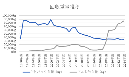 1991年に始めた牛乳パックの回収運動によって、2025年3月までの34年間で、約6,000万枚(2,000トン)を集めて、トイレットロール約1,000万個の原料とすることができました。